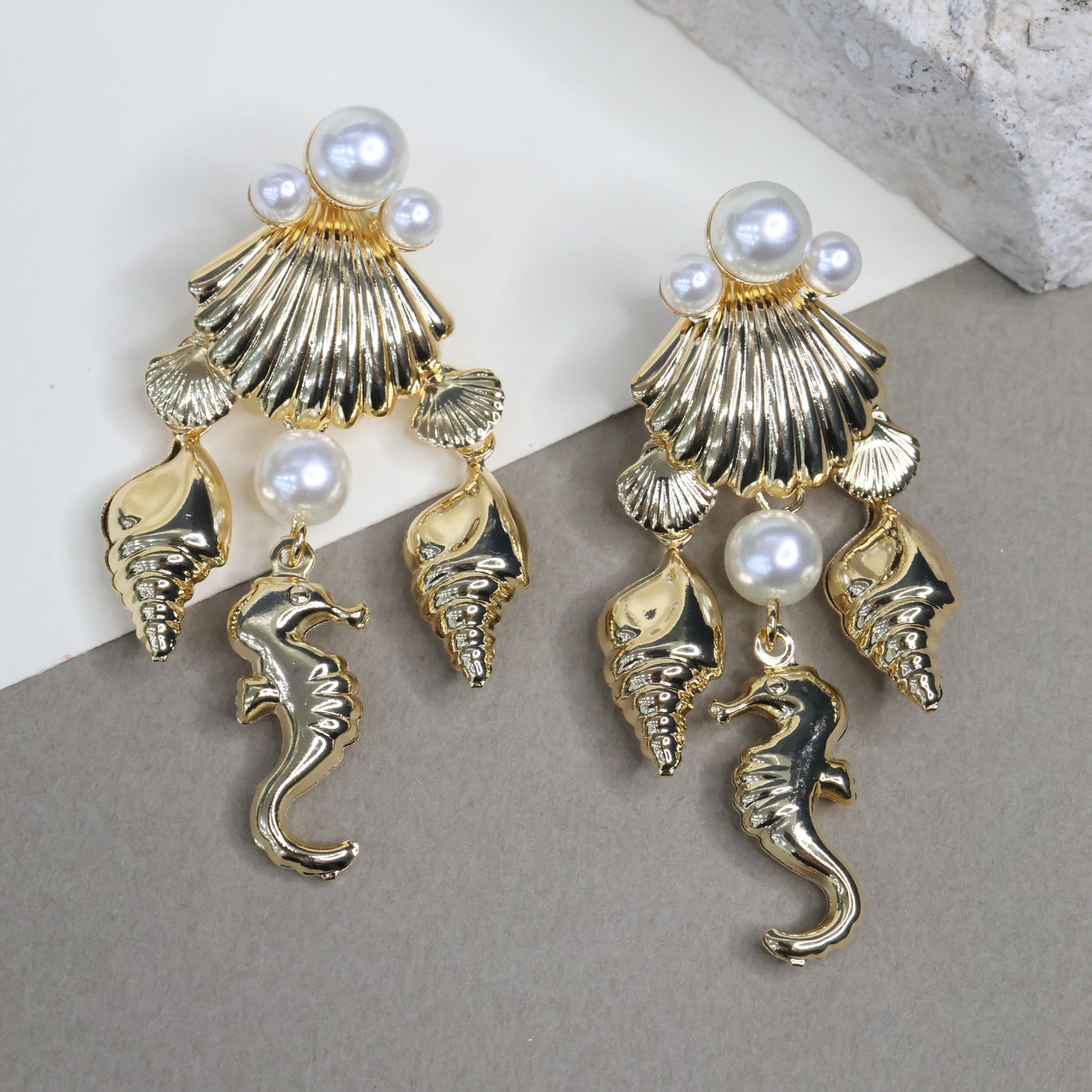 BRINCO DE CONCHA C/ PÉROLA E CAVALO MARINHO BANHADO A OURO
